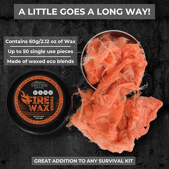 Tactiko Fire Wax - Burns Up to 5 Minutes, 50 Uses, 60g - Perfect for Wet Wood - Compact, Water & Wind Resistant - Camping Gear, Survival Kit, Hikers, Emergency Use - U.S. Company